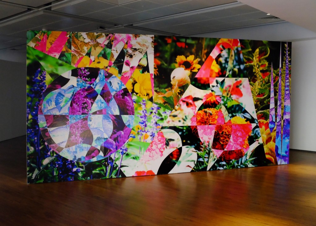 The first installation, Spooky Action, took its title from the quantum physics phrase “spooky action at a distance”—a reference to the unseen, the interconnected and the unfathomable. This large‑scale, highly saturated collage was constructed from images shot in flowerbeds in Victoria Park, Hackney. Through fragmentation and exaggerated scale, the work invited viewers to imagine non‑human perception, suggesting the viewpoint of a bee navigating an immense floral landscape.