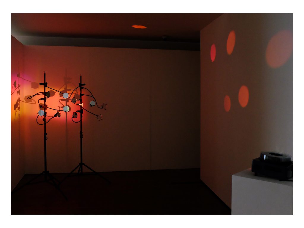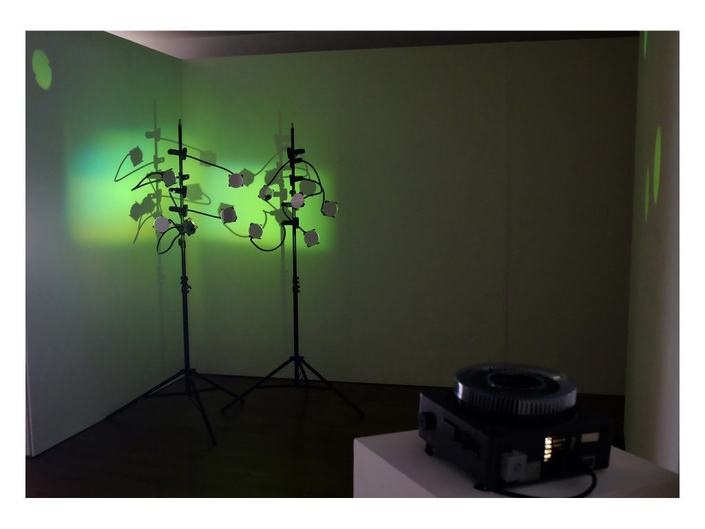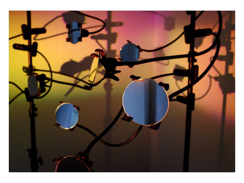 The second installation, Vibration, consisted of small circular mirrors mounted on photographic lighting stands, onto which abstract colour was projected using a 35mm slide projector. The shifting reflections, cast in an entirely analogue register, played with phenomenology and the mechanics of seeing—light, colour, surface and movement.
