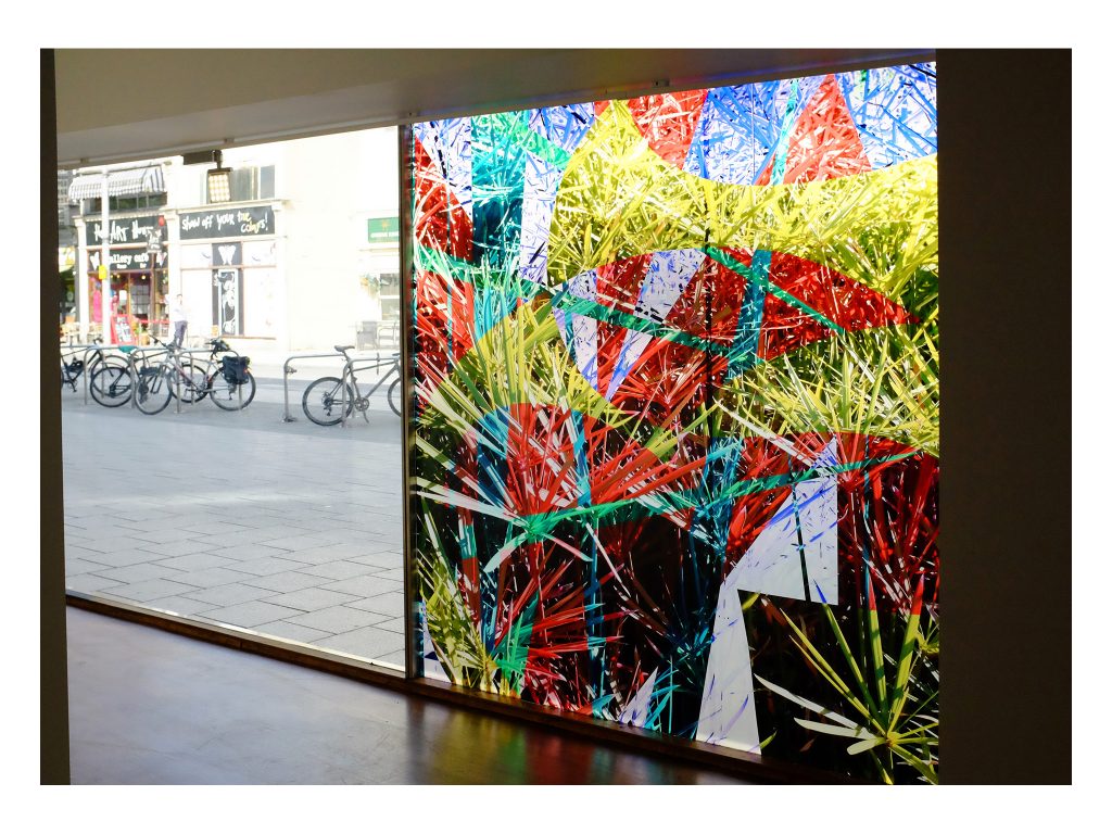 The third installation, Let All the Children Boogie (a reference to David Bowie), took the form of a transparent vinyl collage applied directly to the gallery’s window. Visible from both inside and outside, the work generated layered and contrasting perceptions depending on the viewer’s position, emphasising simultaneity, transparency and the mutability of image‑space.