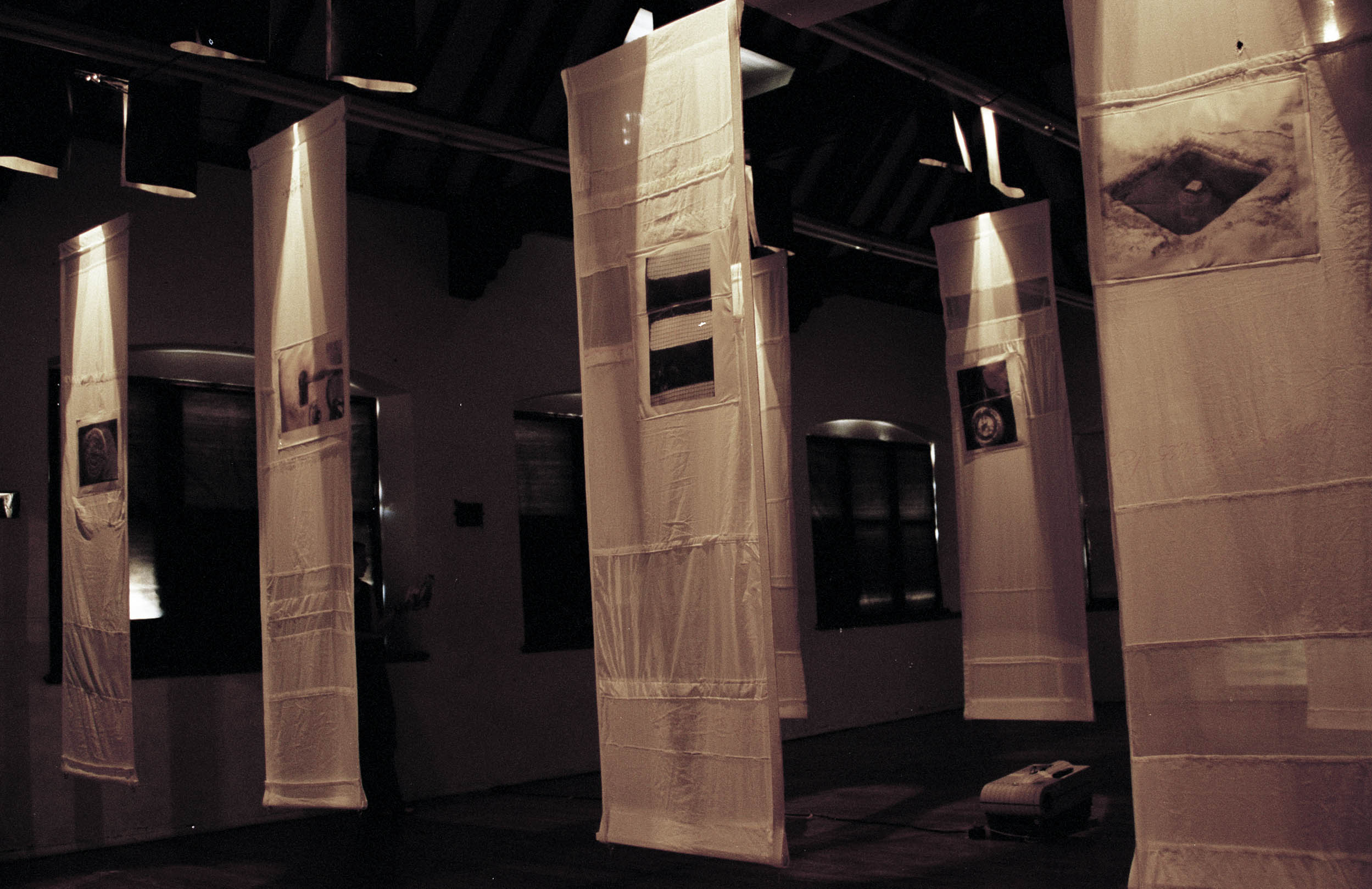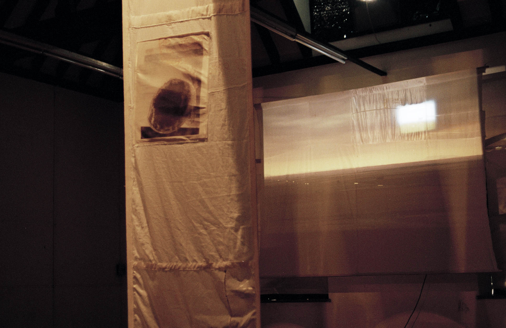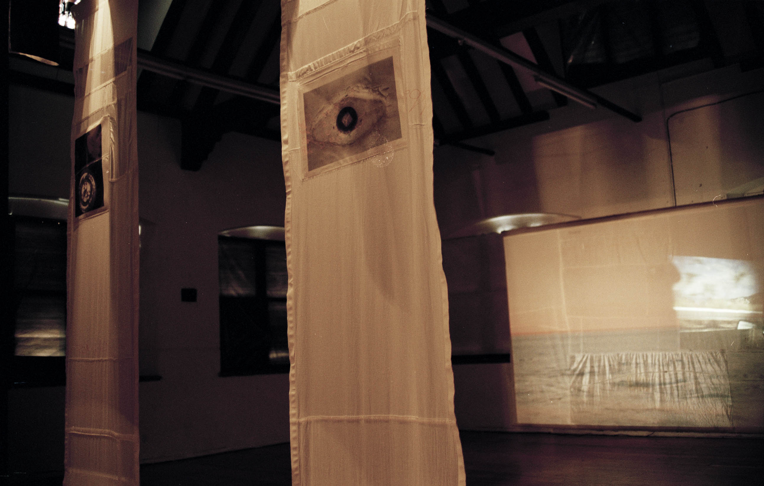 The installation comprised hanging banners, fabric screens, and a layered sequence of video and slide projections. These elements were arranged to shape a shifting, immersive environment that invited audiences to move through overlapping zones of stillness, projection, shadow and reflection. The work drew on states that hover between categories—between urban and rural, between different modes of consciousness, and between the familiar and the uncanny. This interest in liminality became central to the work’s conceptual framework, positioning the viewer inside a space where meaning remained open, unstable, and in transition.