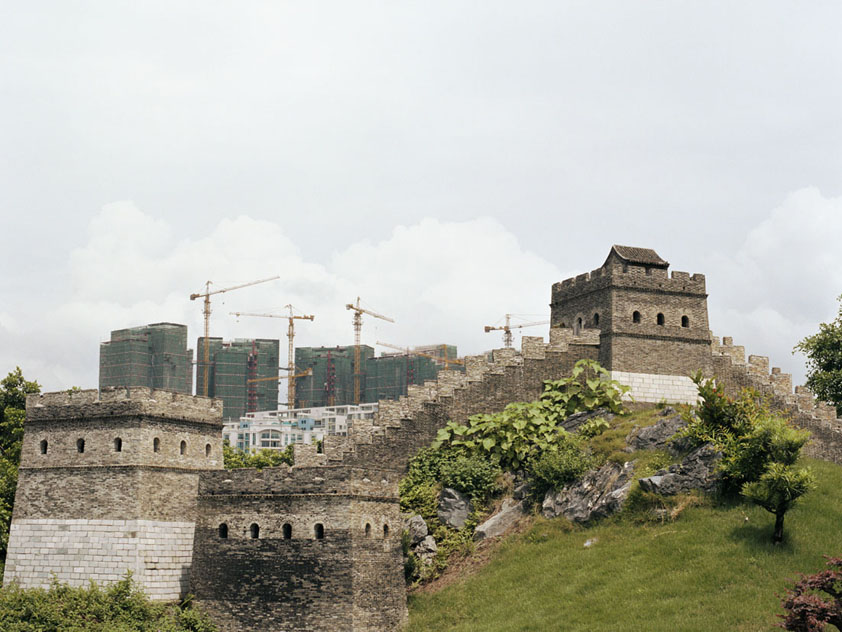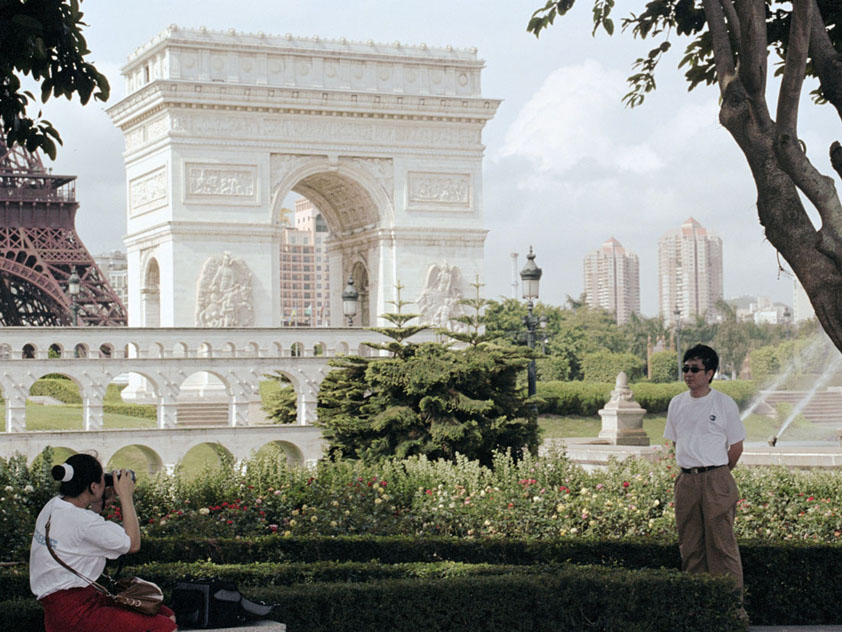 These photographs feature miniature versions of internationally recognisable landmarks—sites from Britain, France, Egypt, India and China—captured in a way that initially appears documentary and authentic. Tourists pose formally in front of these iconic backdrops, echoing common rituals of cultural tourism and reinforcing the familiar visual codes through which we identify place, heritage and national identity. Yet the images are not what they seem. Jandrell photographed these scenes not in the countries represented, but in theme parks in Shenzhen, southeastern China—sites dedicated to reproducing famous global monuments at reduced scale.