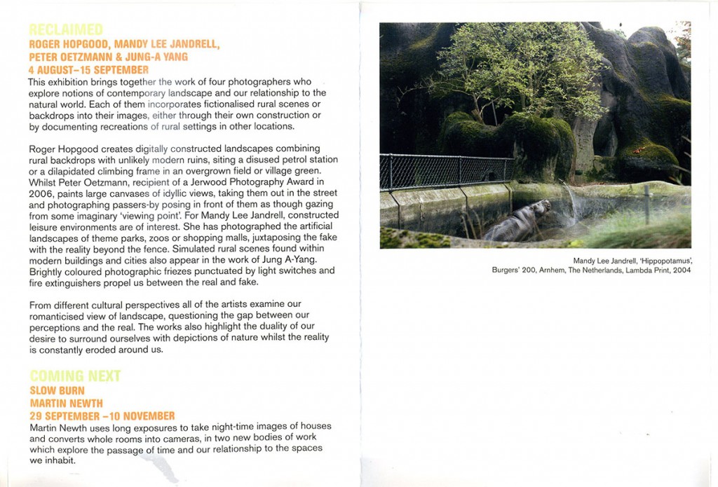 This exhibition brings together the work of four photographers who each, through the use of fictionalised rural scenes and backdrops, explore contemporary notions of landscape and our relationship to the natural world. From different cultural perpectives all of the artists examine our romanticised view of landscape, questioning our gap between our perceptions and the real. The works also highlight the duality of our desire to surround ourselves with depictions of nature whilst the reality is constantly eroded around us.